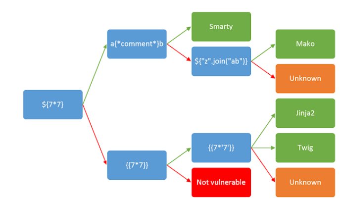 为了利用潜在的SSTI漏洞,我们首先需要确认其存在。在Google上搜索常见的SSTI载荷后,我们找到了这篇Hacktricks文章,其中展示了各种不同模板引擎的利用技术。下图显示了如何识别SSTI漏洞是否存在,以及如何找出正在使用哪个模板引擎。一旦确定了引擎,就可以制作更具体的载荷来实现远程代码执行。