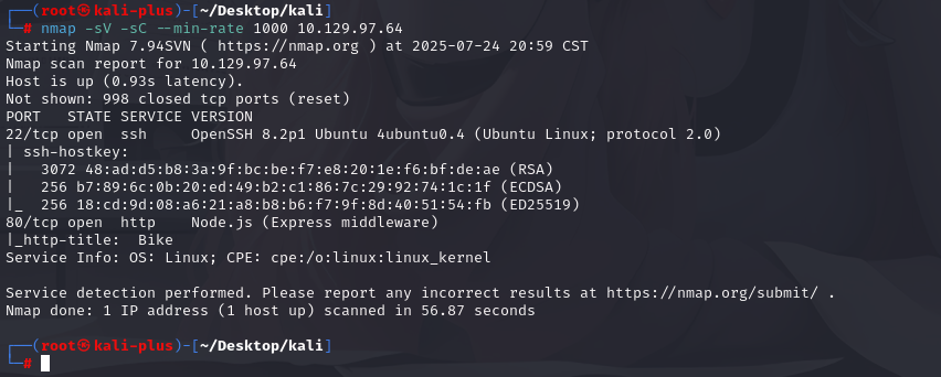 扫描结果显示端口22(SSH)是开放的,但是我们现在会忽略它,因为我们没有可以用来认证的凭证或密钥。我们还发现端口80是开放的,上面运行着一个HTTP Node.js服务器,并且使用了Express框架。