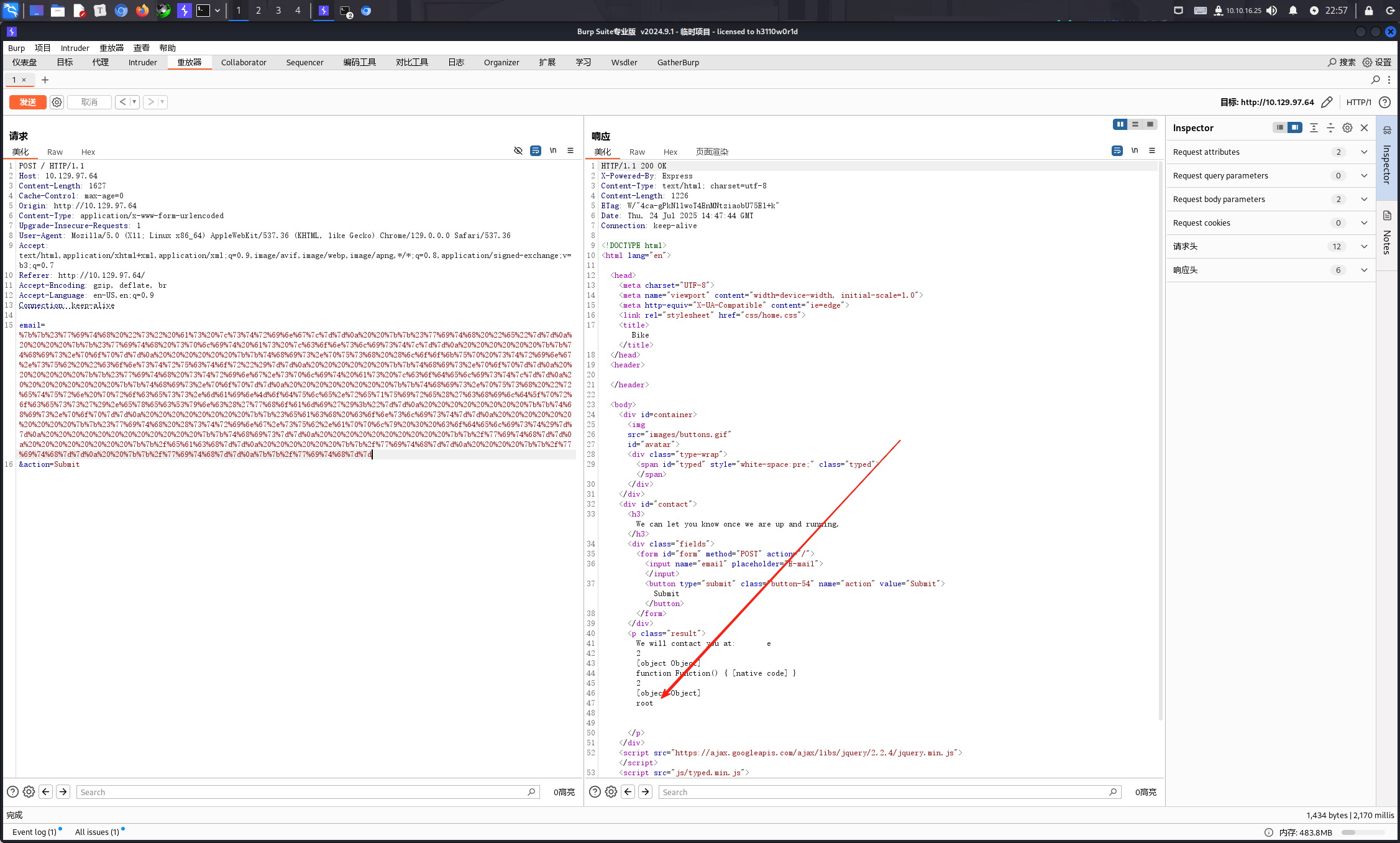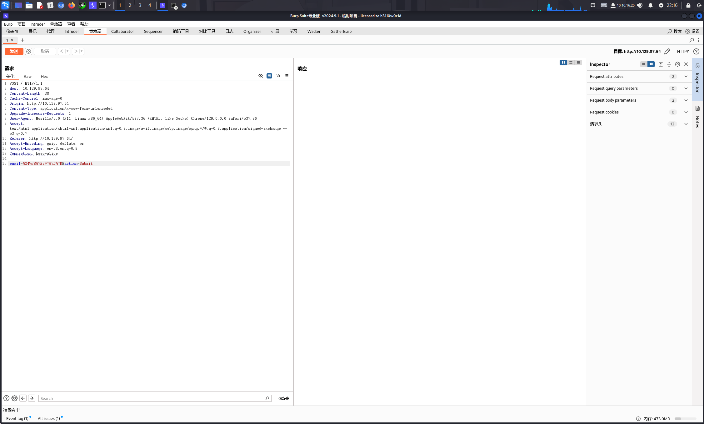 复制底部窗格中经过URL编码的有效载荷,并通过请求标签粘贴到email=字段中。你会得到类似下图的内容。