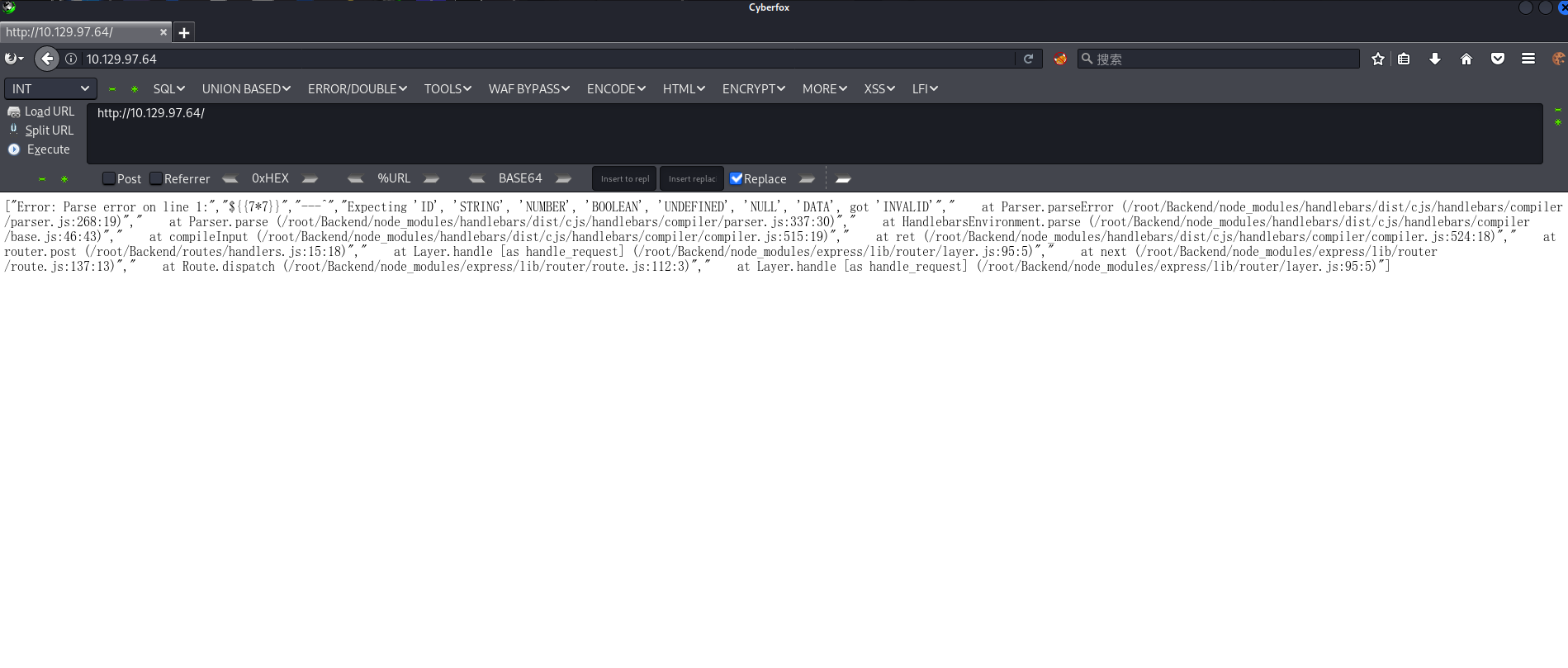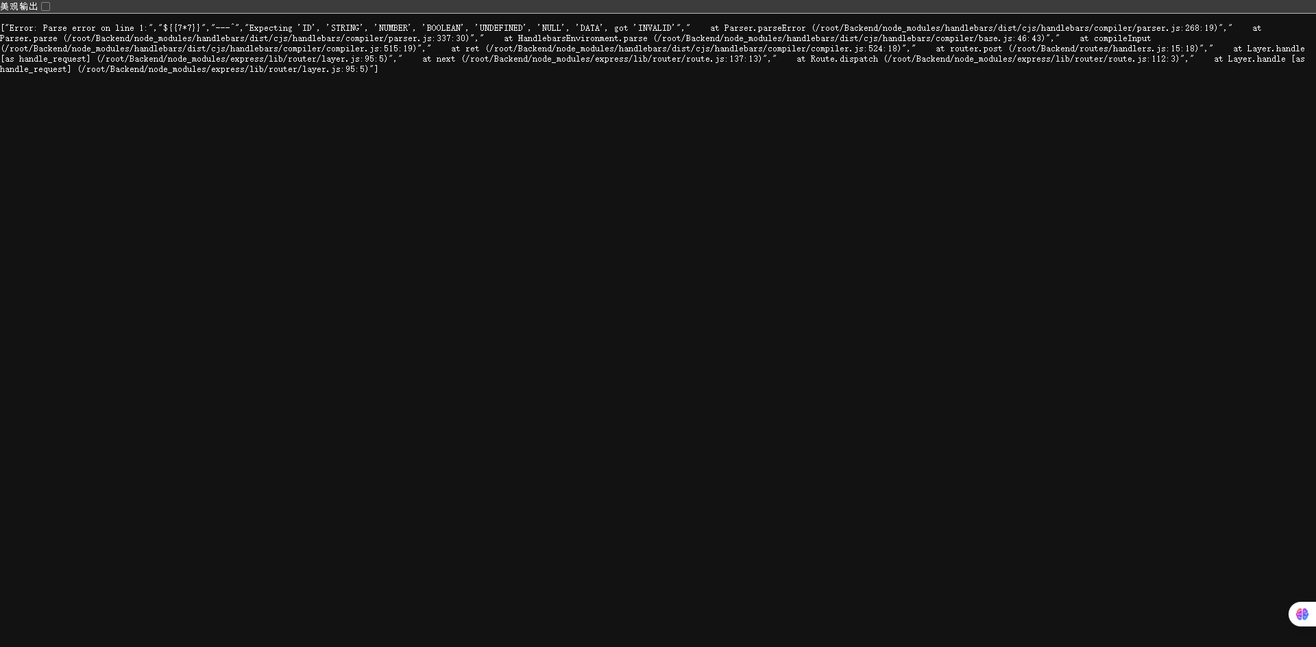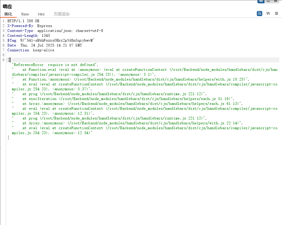 这意味着载荷确实被模板引擎检测为有效,但是代码存在一些错误,无法执行。错误并不总是一件坏事。相反,对于渗透测试人员来说,它可以提供有价值的信息。在这种情况下,我们可以看到服务器是从/root/Backend目录运行的,同时也表明正在使用Handlebars模板引擎。