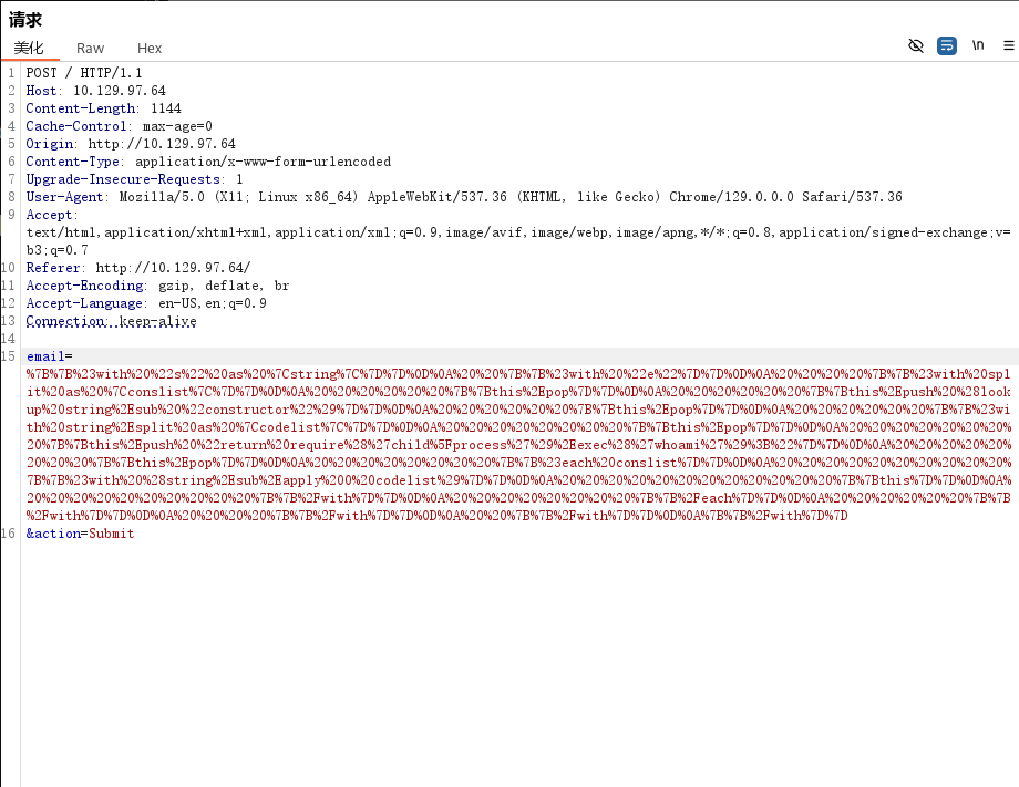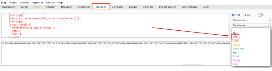 {{/with}}按照之前所示对有效载荷进行URL编码,然后使用BurpSuite的Repeater发送它。