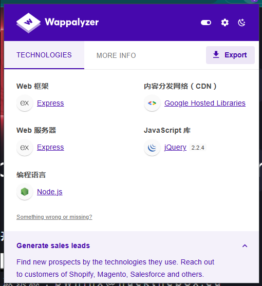 Nmap和Wappalyzer都报告称该服务器是基于Node.js构建的,并且使用了Express框架。