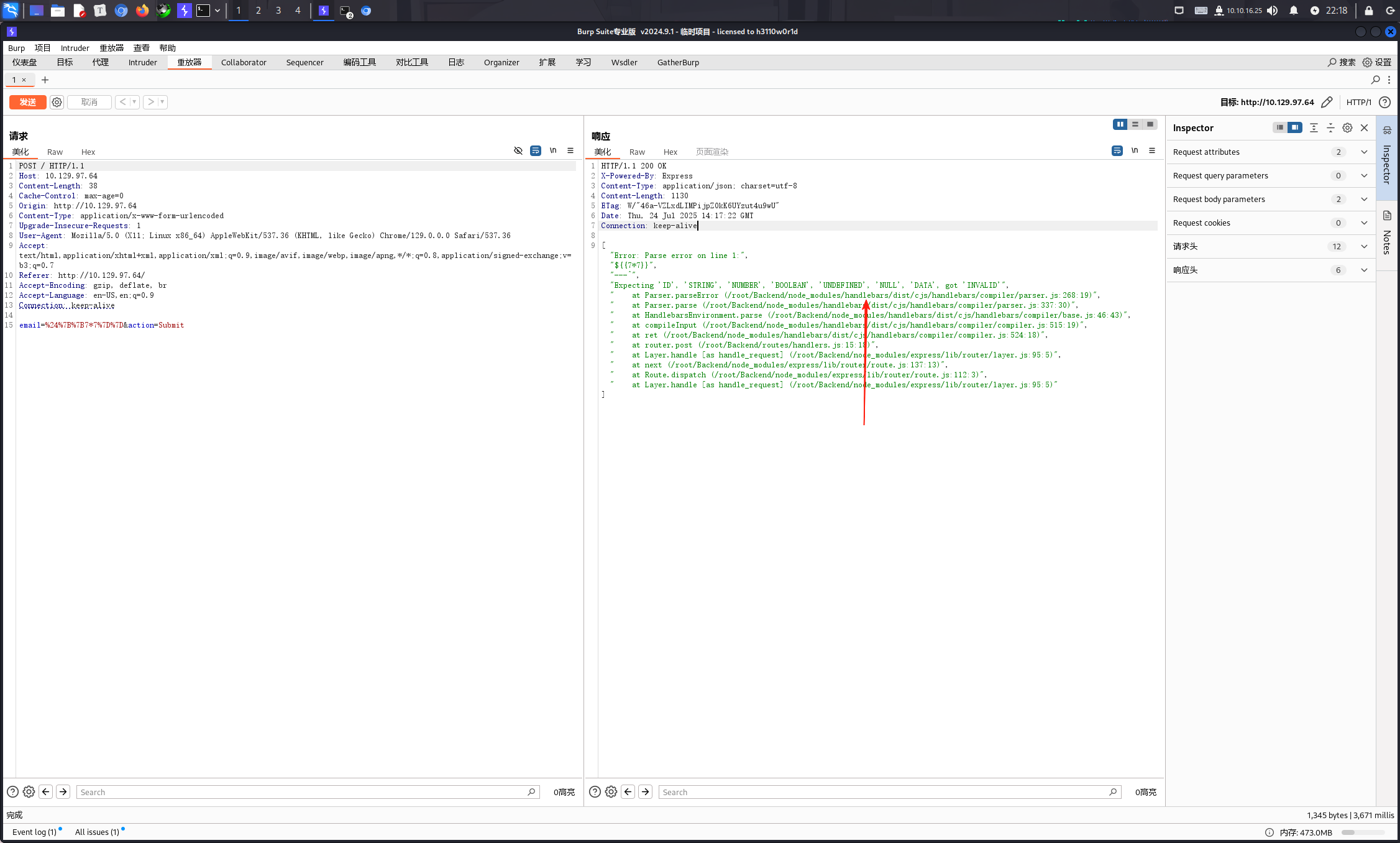 {{/with}}对有效载荷进行URL编码,然后按照之前所示,使用Repeater模块发送。返回的响应如下: