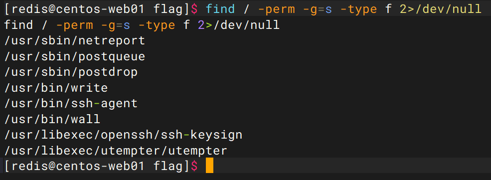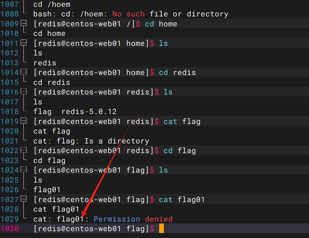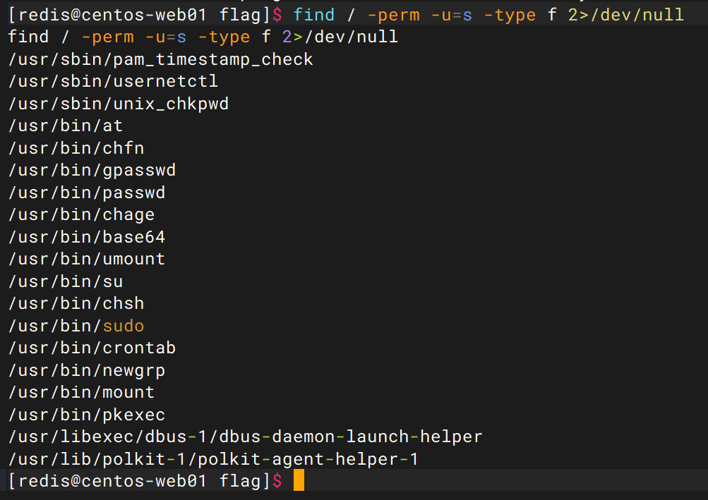 在家目录的redis用户下找到了flag01,尝试cat发现权限不够,这个时候我们就要尝试命令行提权了
