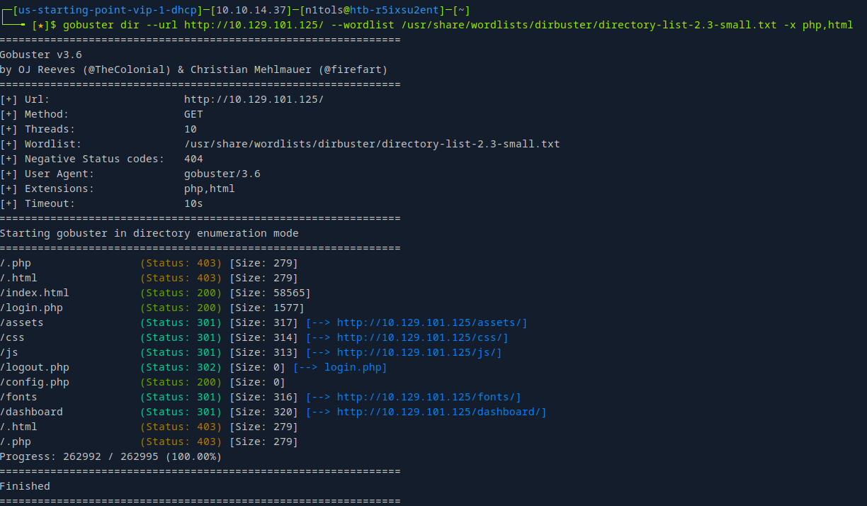 └──╼ [★]$ gobuster dir --url http://10.129.101.125/ --wordlist /usr/share/wordlists/dirbuster/directory-list-2.3-small.txt -x php,html字典自己从网上下载即可