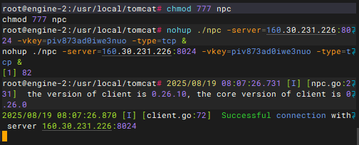 linux执行:nohup ./npc -server=160.30.231.226:8024 -vkey=piv873ad0iwe3nuo -type=tcp &