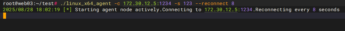 ./linux_x64_agent -c VPS1:1234 -s 123 --reconnect 8