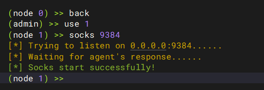 过一会儿会在控制端看见新节点node 1加入,这个就是经过VPS1代理的VPS2,先back,选择use 1,socks 9384,就可以在9384建立对web3的多层代理,同时也不会影响之前在web1上建立的代理