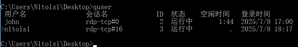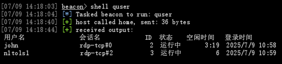 隐藏日志(修改审计策略或清空日志)使用quser查看计算机上的用户会话信息,quser信息参考:https://learn.microsoft.com/zh-cn/windows-server/administration/windows-commands/quser