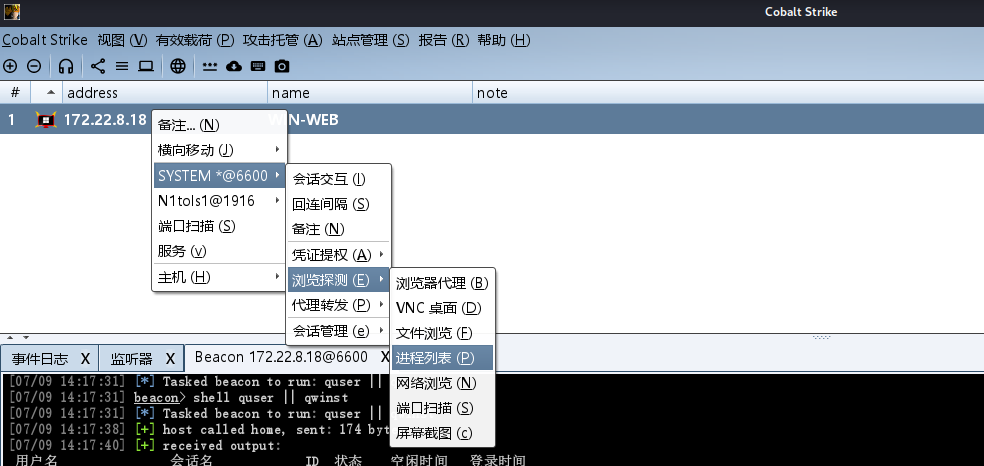 我们在使用cs执行命令的时候都需要加上shell才可以进行命令执行,比如我们上面执行的查看在线用户的命令,当然输出时间可能不会很快应该是我服务器在国外的原因