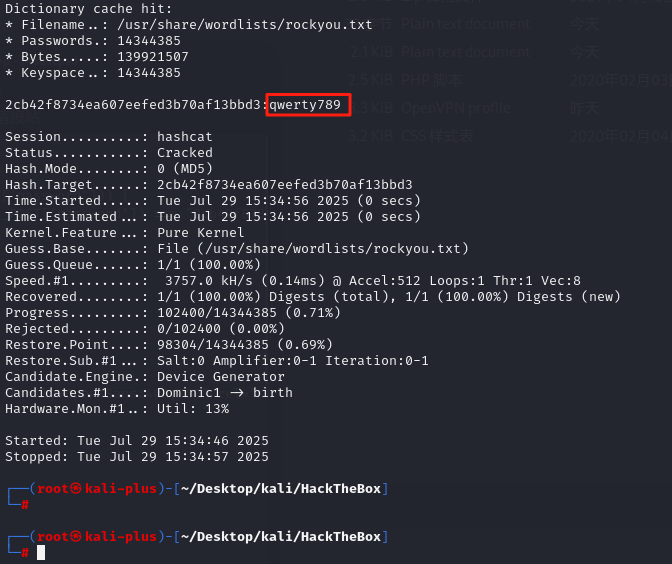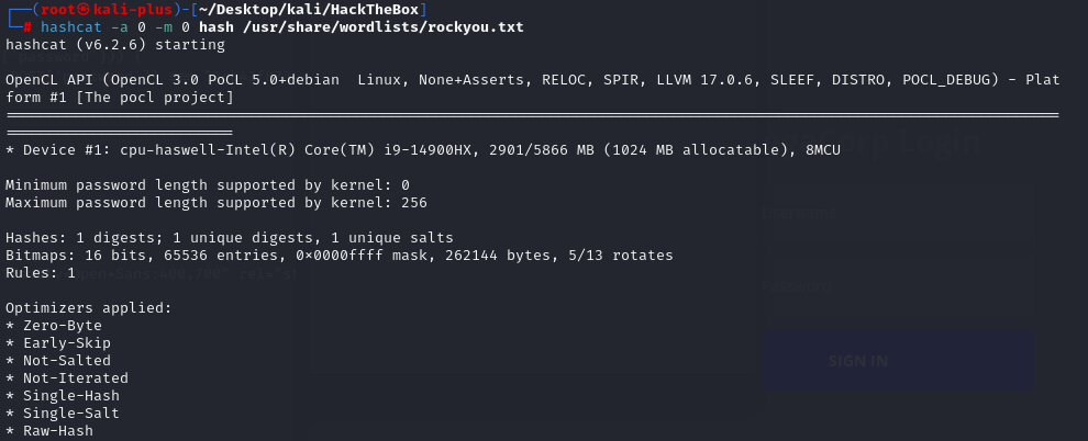 我们将把哈希值放入一个名为 hash 的文本文件中,然后使用 hashcat 进行破解。