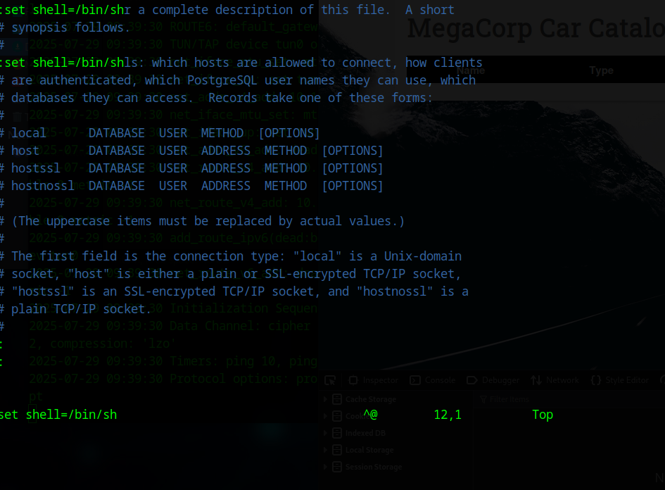 postgres@vaccine:~$ sudo /bin/vi /etc/postgresql/11/main/pg_hba.conf我们成功以超级用户(具有 root 权限)身份打开了 vi 编辑器: