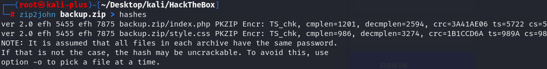 └─# zip2john backup.zip > hashes