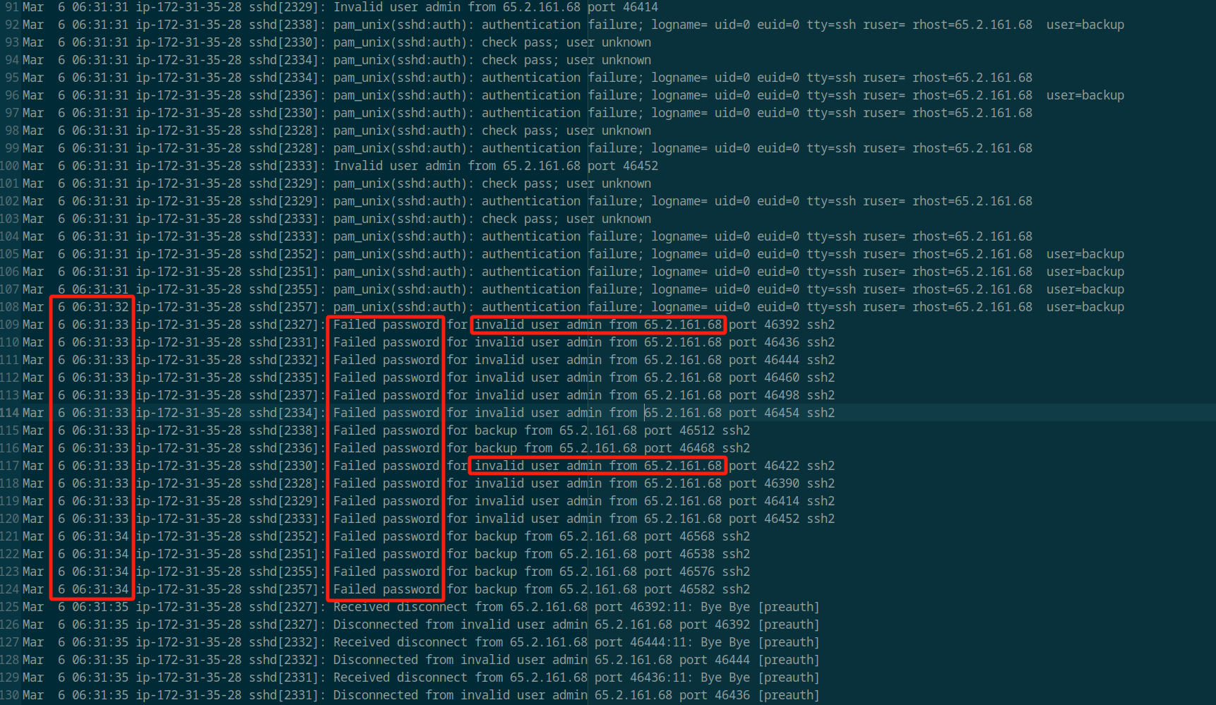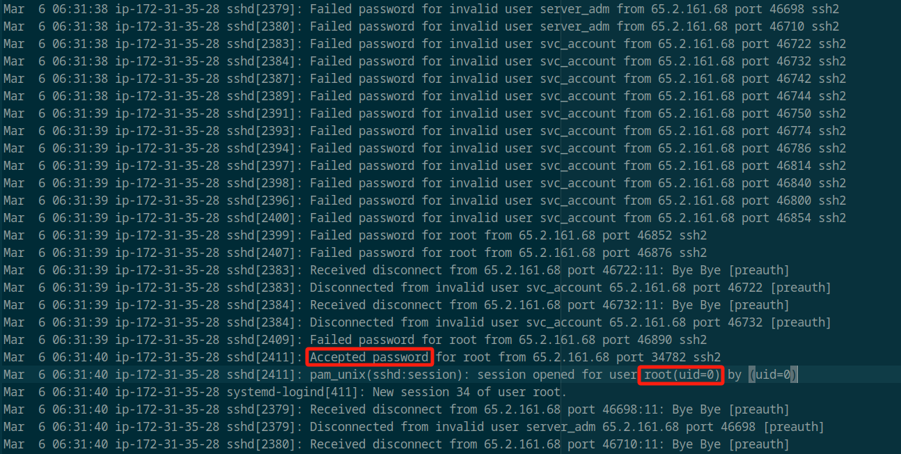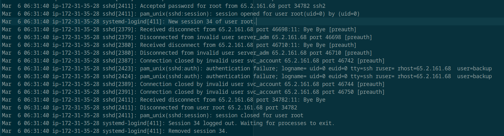 在提供的日志中,来自单一IP地址65.2.161.68的多次尝试表明存在暴力破解攻击。特别需要注意的是这些时间戳,它们全部集中在几秒之内。在排查暴力破解攻击时,一个很好的经验法则是思考:“人类是否可能手动如此频繁地进行认证尝试”。如果答案是否定的,则建议进一步调查。