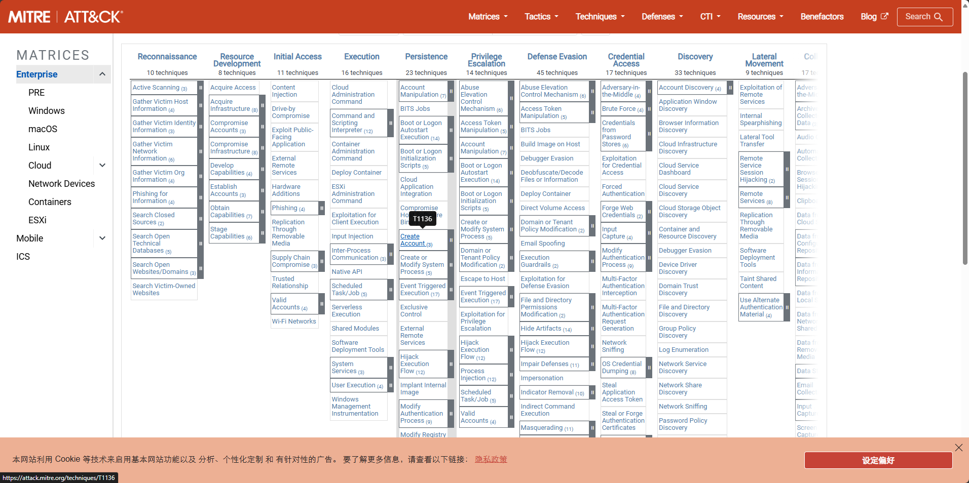 我们了解到,创建新用户账户是实现持久化的一种方法,且该账户是受 compromise 主机上的本地账户。我们现在需要利用MITRE ATT&CK框架将其转化为一个技术ID。MITRE ATT&CK框架对攻击者使用的各种战术和技术进行了分类。我们可以利用企业矩阵,在“持久化(Persistence)”类别下找到“创建账户(Create Account)”技术,其详细信息如下,技术ID为T1136。