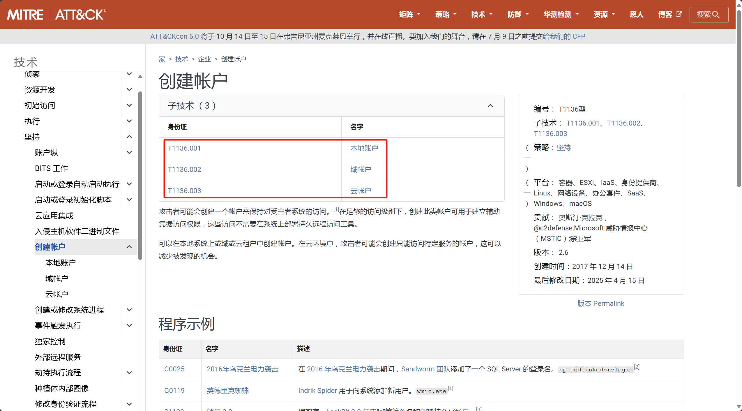 让我们深入研究这一技术,查看其子技术。子技术使我们能够更细致地剖析攻击。例如,可能创建的账户有多种类型,在下方截图中我们可以看到有域账户、本地账户和云账户。在当前调查中,我们已知涉及的是本地账户,因此对应的子技术是T1136.001。