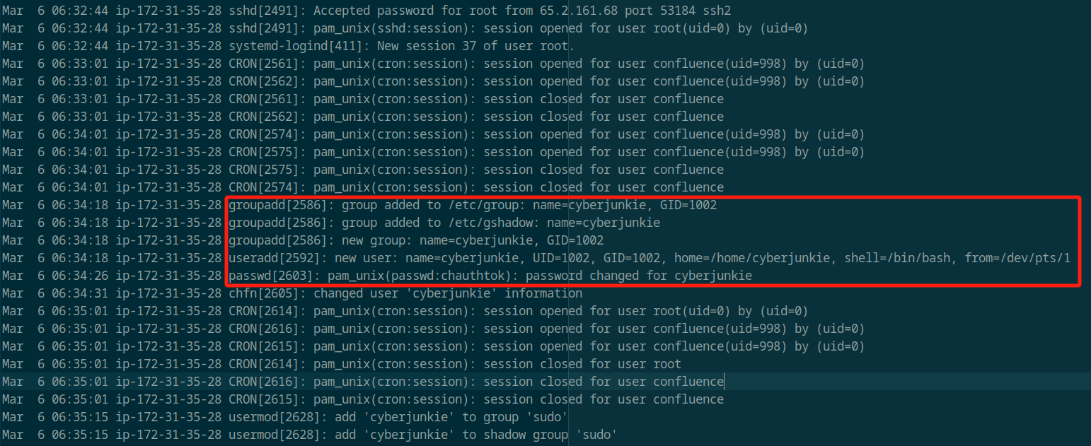 日志显示创建了一个名为cyberjunkie的新用户,该用户随后被添加到sudo组以获得提升的权限。在Linux系统上,sudo组是一个特殊组,赋予用户以管理员权限(也称为超级用户或root权限)运行命令的能力。“sudo”一词代表“超级用户执行”。 默认情况下,Linux系统的设计将普通用户账户与全能的管理员账户(称为root账户)分开。root账户对整个系统拥有不受限制的访问权,包括修改系统文件、安装软件和执行其他关键操作的能力。然而,通常认为以root用户身份执行日常任务存在风险,因为错误或恶意操作可能会造成严重后果。 sudo命令允许授权用户暂时以root用户身份执行特定命令。这些用户通常是sudo组的成员。通过使用sudo,管理员可以在维护整体系统安全性的同时,将特定权限委派给普通用户。属于sudo组的用户被称为sudo用户。 要授予用户sudo权限,管理员需要将该用户添加到sudo组。这可以通过修改系统的用户管理配置文件或使用带有适当选项的usermod命令来完成。 一旦用户被添加到sudo组,他们就可以通过在命令前加上sudo来执行具有提升权限的命令。