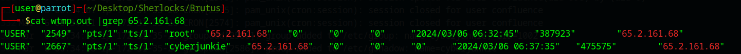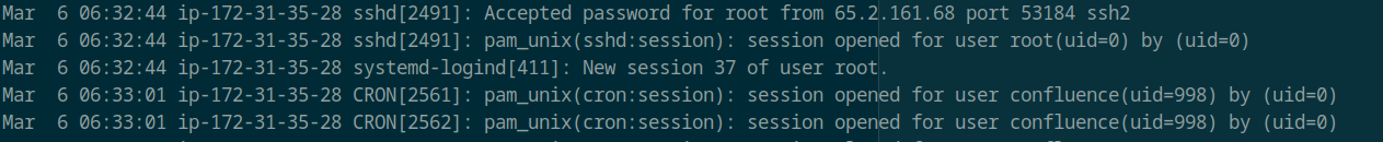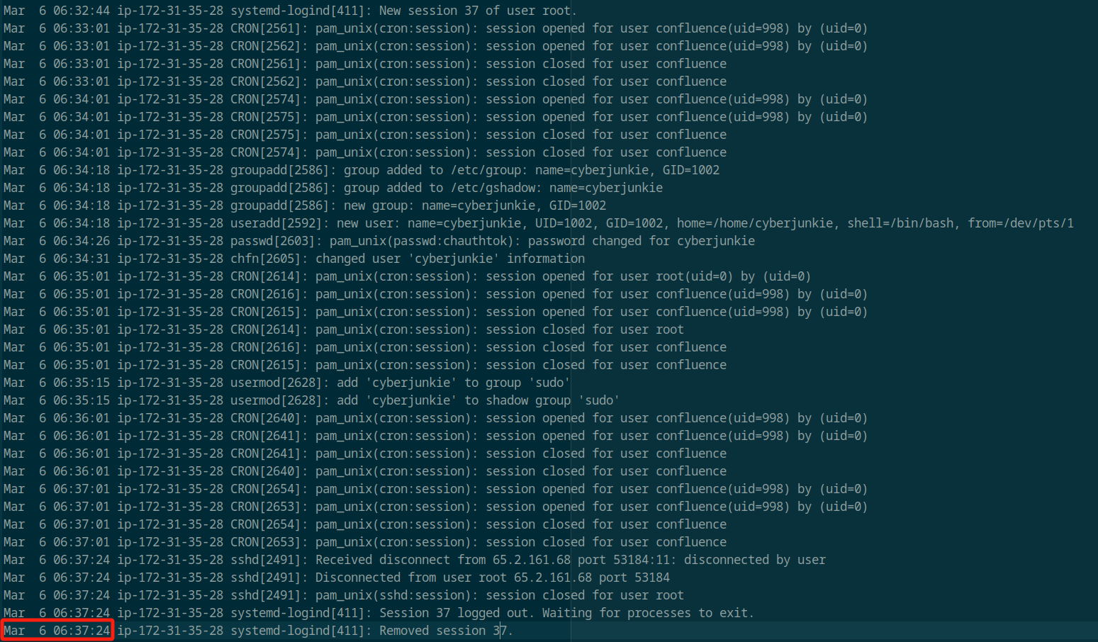 查看 wtmp 的输出,我们能够确认威胁行为者于 06:32:45 成功打开了一个交互式终端会话。