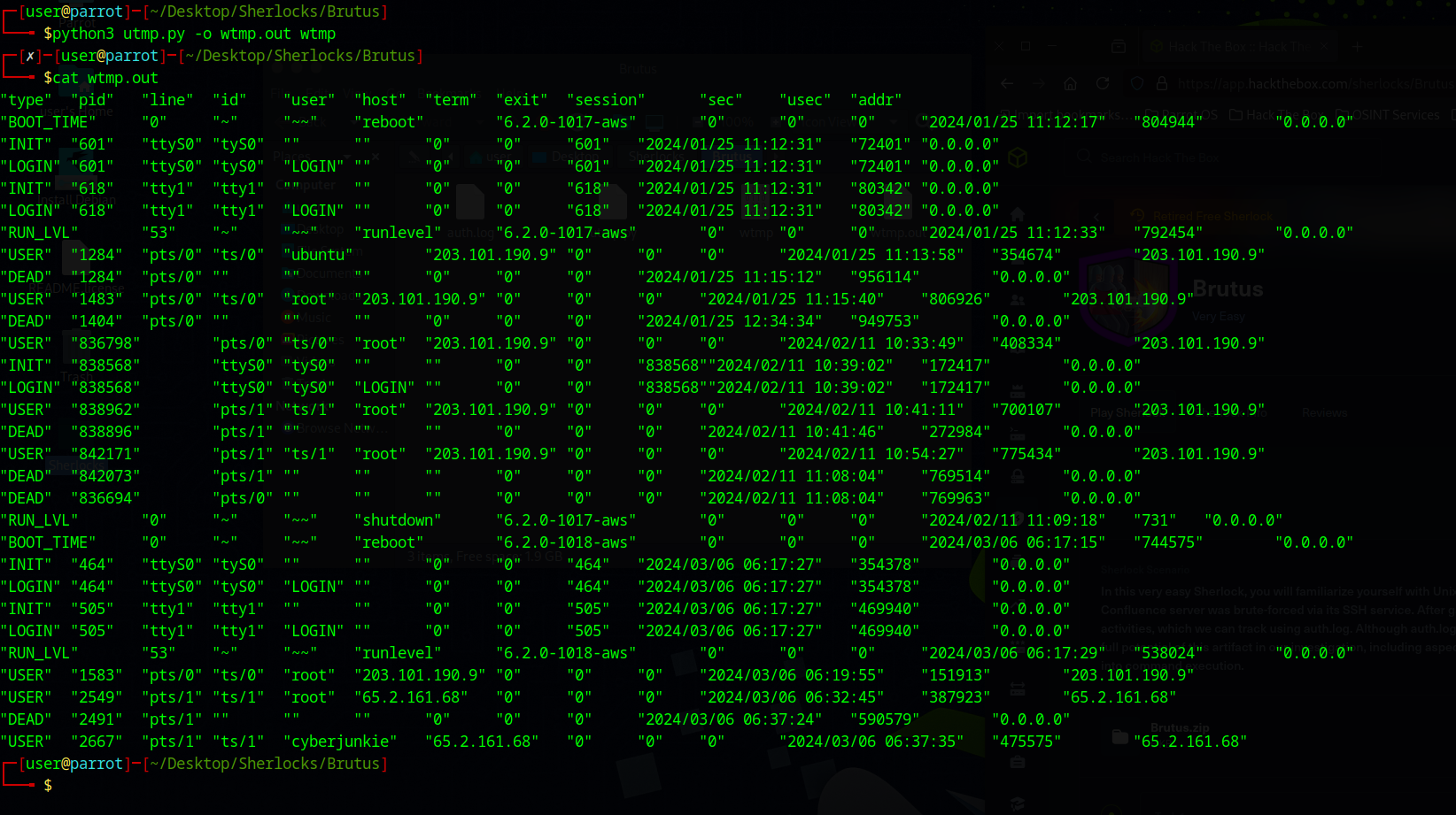 python3 utmp.py -o wtmp.out wtmp答案为:2024-03-06 06:37:24